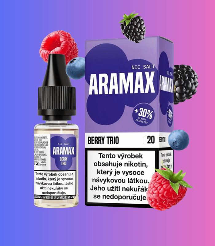 Aramax Salt Berry Trio – sladká jahoda, plná borůvka a osvěžující malina v harmonickém mixu. Nikotinová sůl, VG/PG 50/50, balení 10 ml, ovocný e-liquid pro MTL vaping.