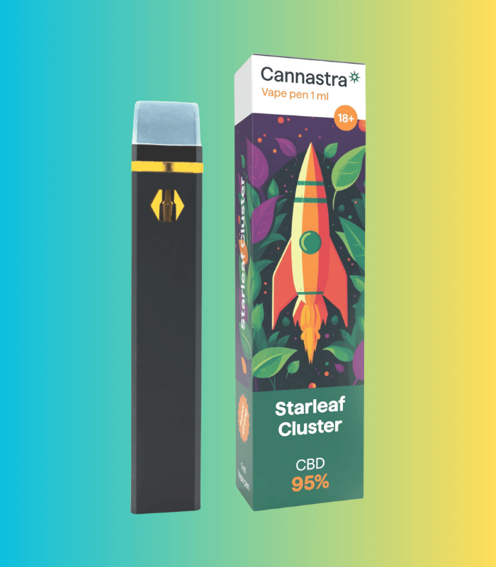 Cannastra CBD 95 % Vape Pen Starleaf Cluster představuje ideální způsob, jak zažít klid, pohodu a rovnováhu v každém potahu. Tento jednorázový vaporizér obsahuje 95 % čistého CBD destilátu, díky čemuž nabízí intenzivní, ale jemný účinek bez psychoaktivních vlivů. S THC pod 0,2 % je produkt plně legální, bezpečný a vhodný pro každodenní použití.