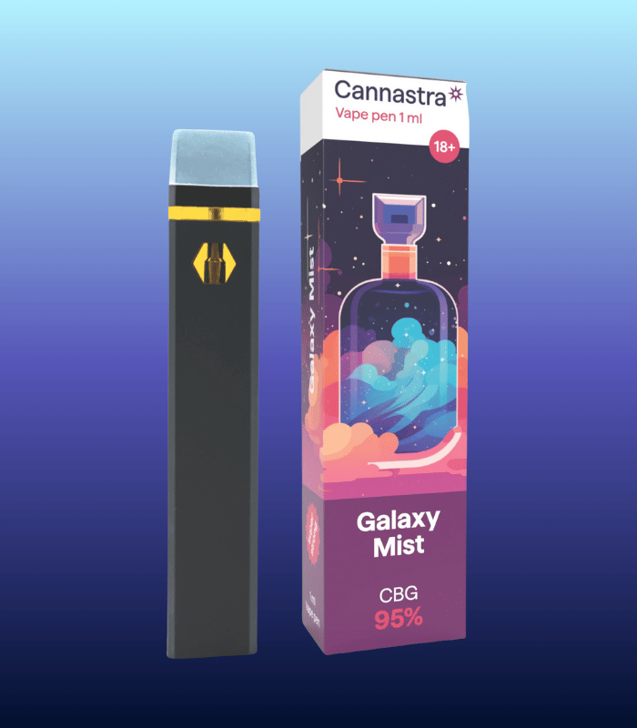Cannastra CBG 95 % Vape Pen Galaxy Mist představuje vrchol kvality v oblasti přírodních kanabinoidů. Tento prémiový jednorázový vaporizér obsahuje 95 % čistého CBG destilátu a přináší hluboký pocit klidu, uvolnění a mentální rovnováhy bez psychoaktivních účinků THC.