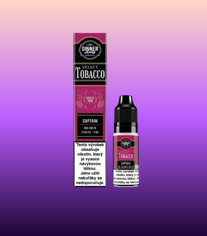 Dinner Lady Bar Salts TOBACCO Captain Tobacco 20mg nabízí sofistikovanou směs jemného tabáku, vanilky a rumu, která vytváří elegantní a dokonale vyvážený chuťový profil. Každý potah přináší hlubokou vůni tabáku, jemně nasládlé tóny vanilky a teplé aroma rumu, které celé chuti dodává nádech luxusu a hřejivosti. Tato příchuť osloví každého, kdo hledá tabákový e-liquid s charakterem a noblesou.
