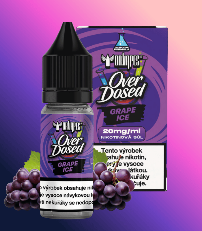 Dr Vapes Overdosed Grape Ice – sladké hrozny doplněné chladivým efektem. Nikotinová sůl, VG/PG 50/50, balení 10 ml, ovocný e-liquid vhodný pro MTL vaping.
