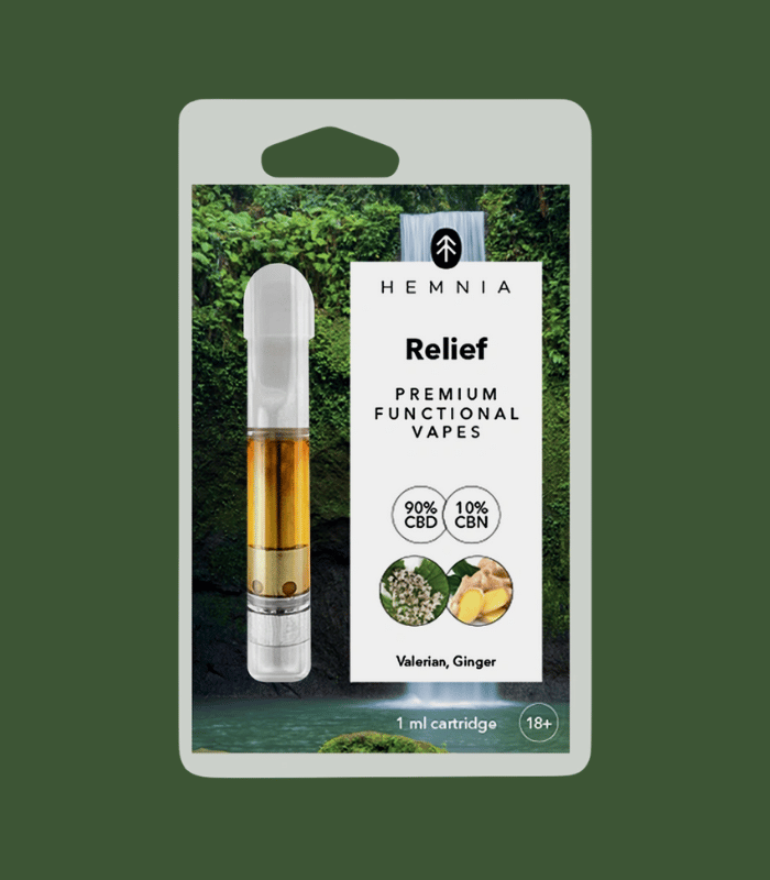 Hemnia Relief Cartridge s 90 % CBD a 10 % CBN, doplněný o kozlík lékařský a zázvor, přináší přirozenou úlevu pro tělo i mysl. Kompatibilní se závitem 510.