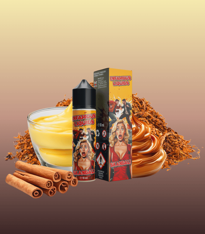 Pokud hledáte tabákové aroma, které spojuje jemnost a sladkost, Infamous Special Skandal vás okamžitě osloví. Tvůrci této příchutě vybrali jemné světlé tabáky, které doplnili o karamelovou sladkost, aromatickou skořici a jemný vanilkový krém. Tato kombinace působí harmonicky, je elegantní a působí jako lahodný dezert v podobě vapingu.