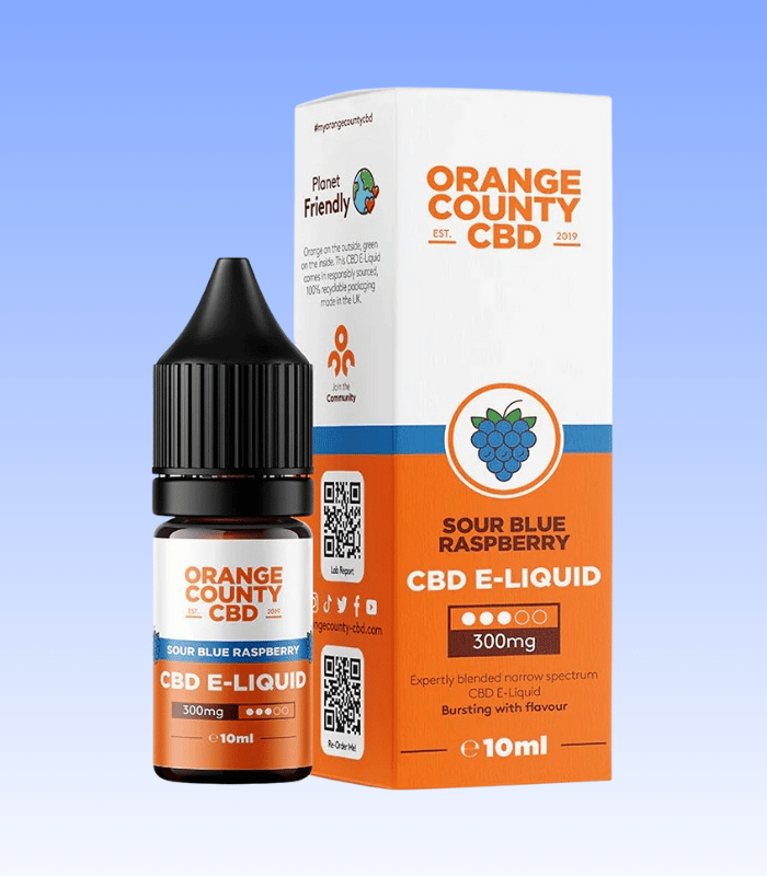 Orange County CBD Sour Blue Raspberry – intenzivní chuť kyselkavých malin s 300 mg CBD. Prémiový britský e-liquid s THC < 0,2 %.