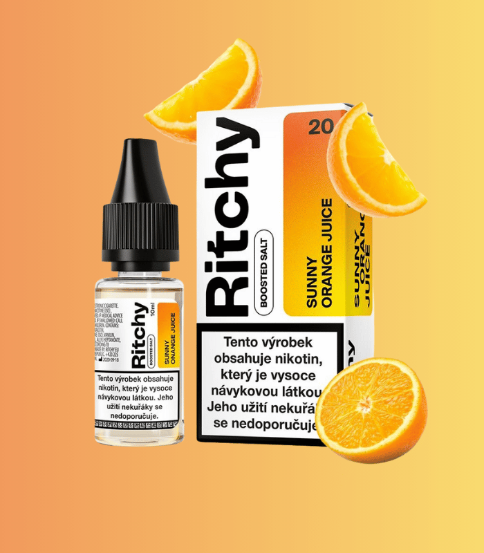 Ritchy Salt Sunny Orange Juice využívá nikotinovou sůl, která zaručuje hladký pocit při potahu bez podráždění krku. Díky rychlejšímu vstřebávání nikotinu do organismu dosáhnete uspokojení i při menším počtu potahů. Tento e-liquid tak poskytuje příjemný a přirozený zážitek z vapingu po celý den.